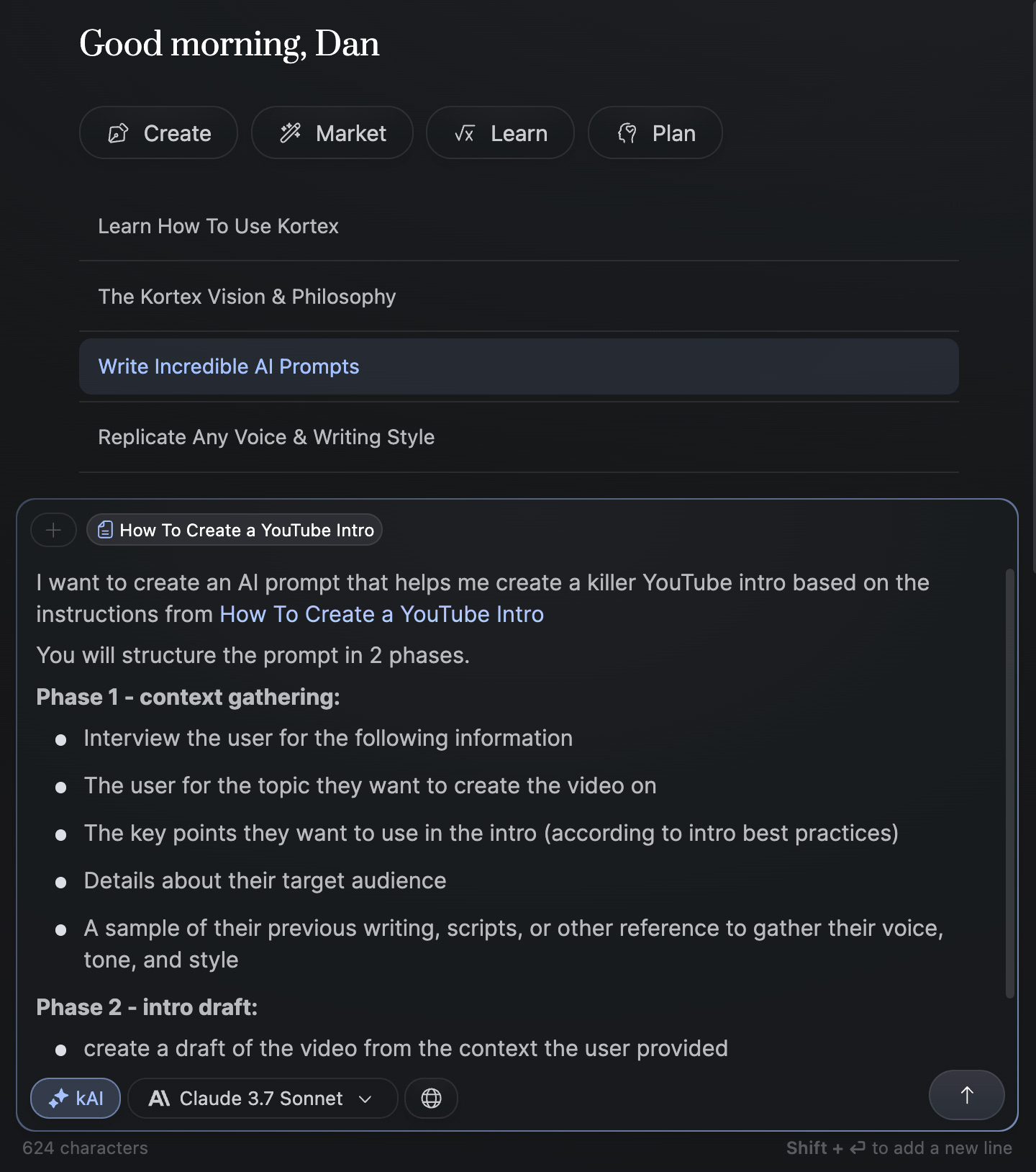 You can either duplicate the prompt here, or go to Chat → Create Incredible AI Prompts inside of Kortex to have this done for you. I like using either Gemini 2.5 Pro or Claude 3.7 Sonnet to do this.